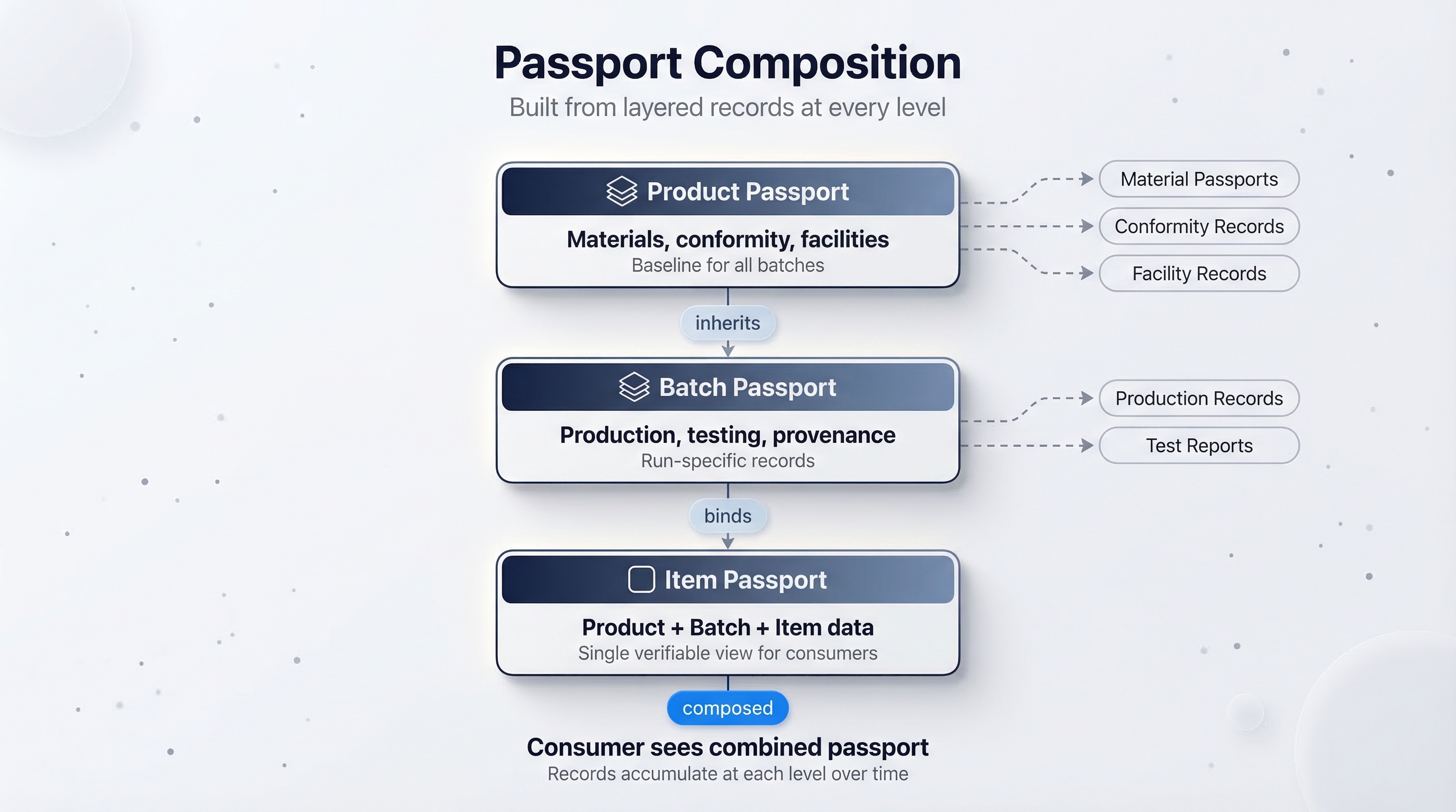 - Product passport accumulates material passports, conformity records, and facility records over time. It defines the baseline data shared by all batches.