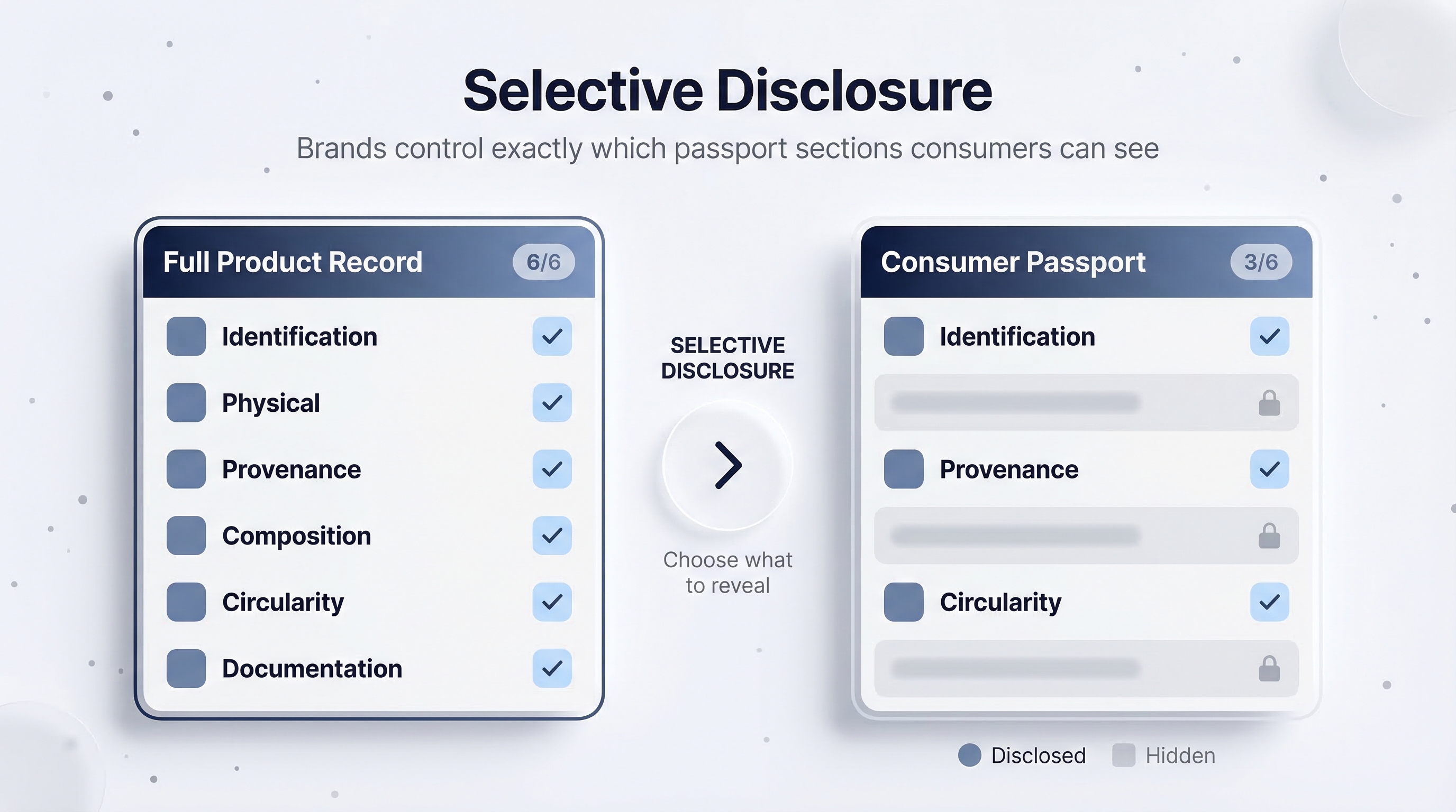 - Check the sections you want to include in this particular passport. You might share full data with a regulatory body but only Identification and Provenance with consumers.